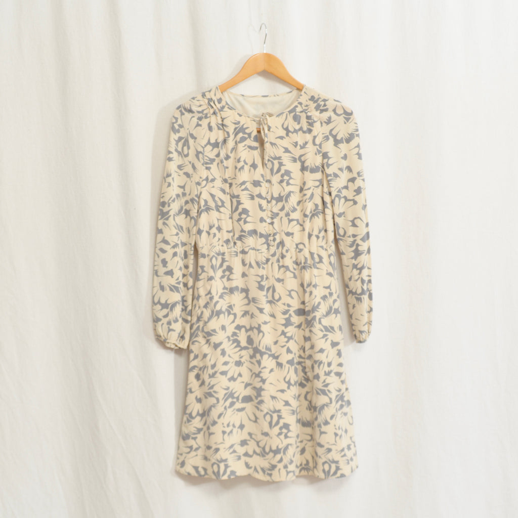 fully lined throughout with a tied keyhole at the neckline and buttons down to the waist - has pockets at the sides - also has a side zip closure at the side