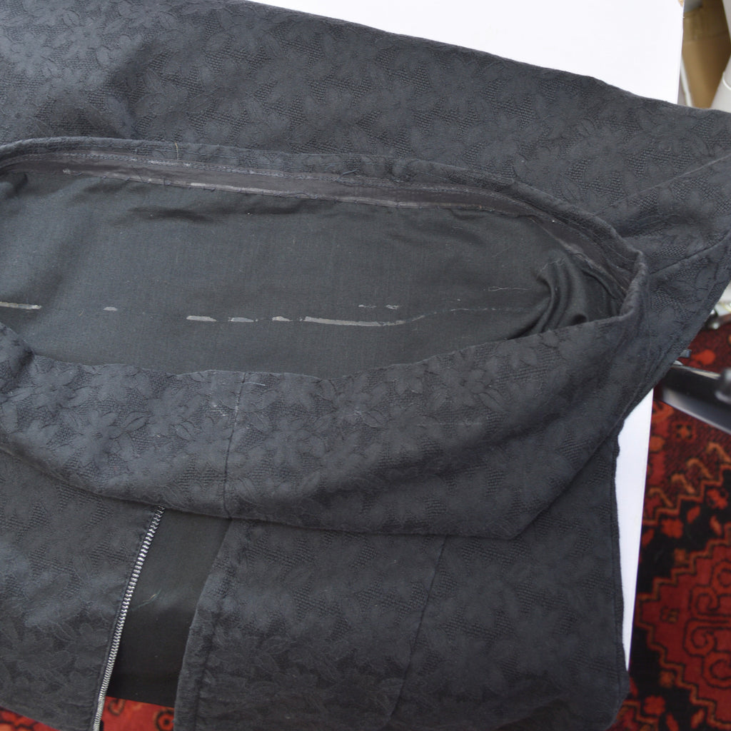 looks as though it was lovingly homemade because the seams are not done by an industrial serger - solid zipper up the back - at some point someone must have hemmed it with glue but this has been undone and the original hem has been mended (there is a still a little bit of glue on the inside from this that is not visible from the outside and does not affect wear)