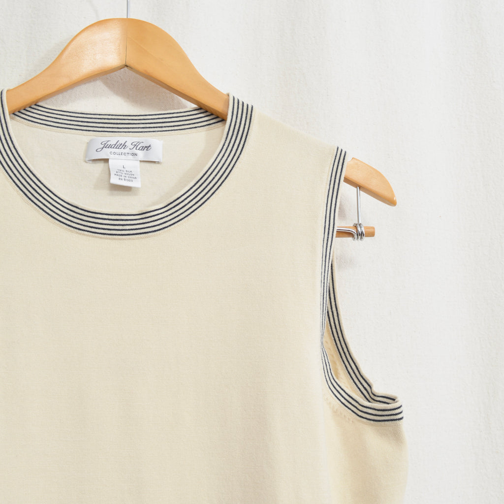 sweater knit silk blend tank with black striped banding around neck and sleeves