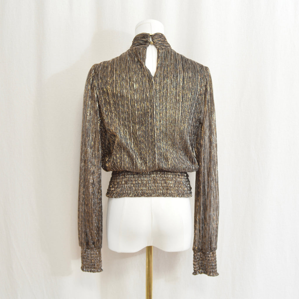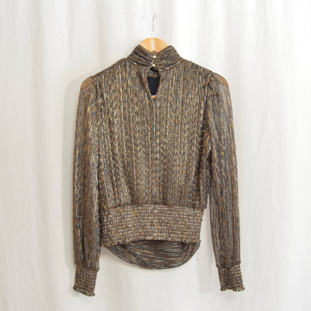 turtleneck tinsel top with cinch waist and back keyhole button